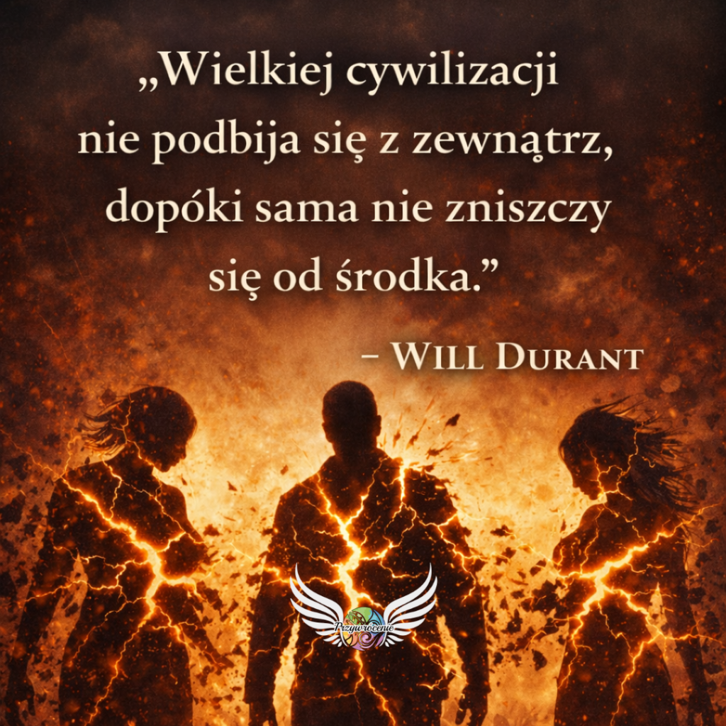 Najazd, kryzys, wojna, upadek gospodarczy — to nie przyczyna. To skutek wcześniejszego rozkładu. Zewnętrzna siła może pokonać tylko to, co już wcześniej osłabło od środka. Silna cywilizacja przetrwa katastrofy. Słaba rozsypie się przy pierwszym wstrząsie.